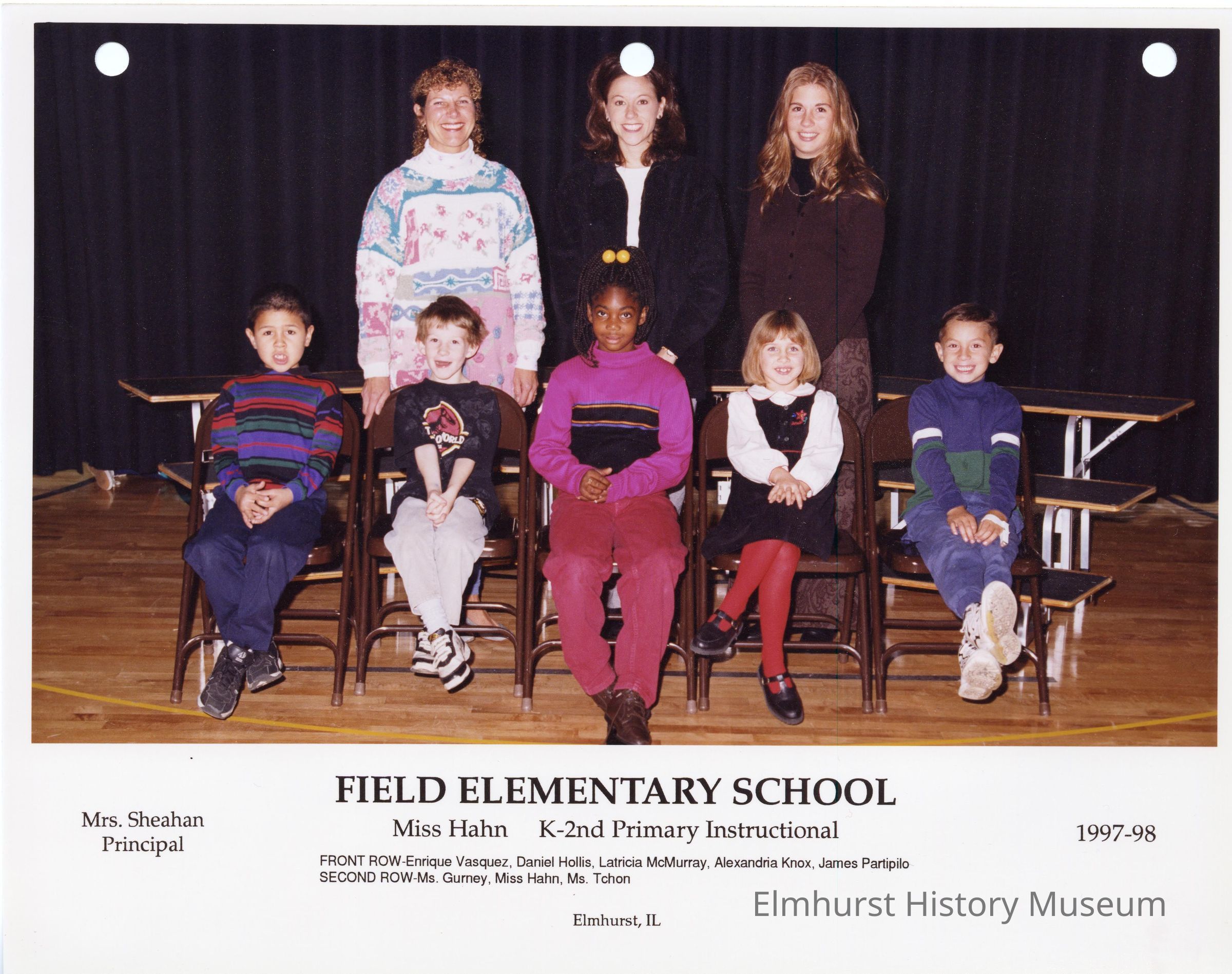 Primary instructional class photograph from Field Elementary School, under teacher Ms. Hahn. Student names are listed at the bottom of the photograph.Photograph Details