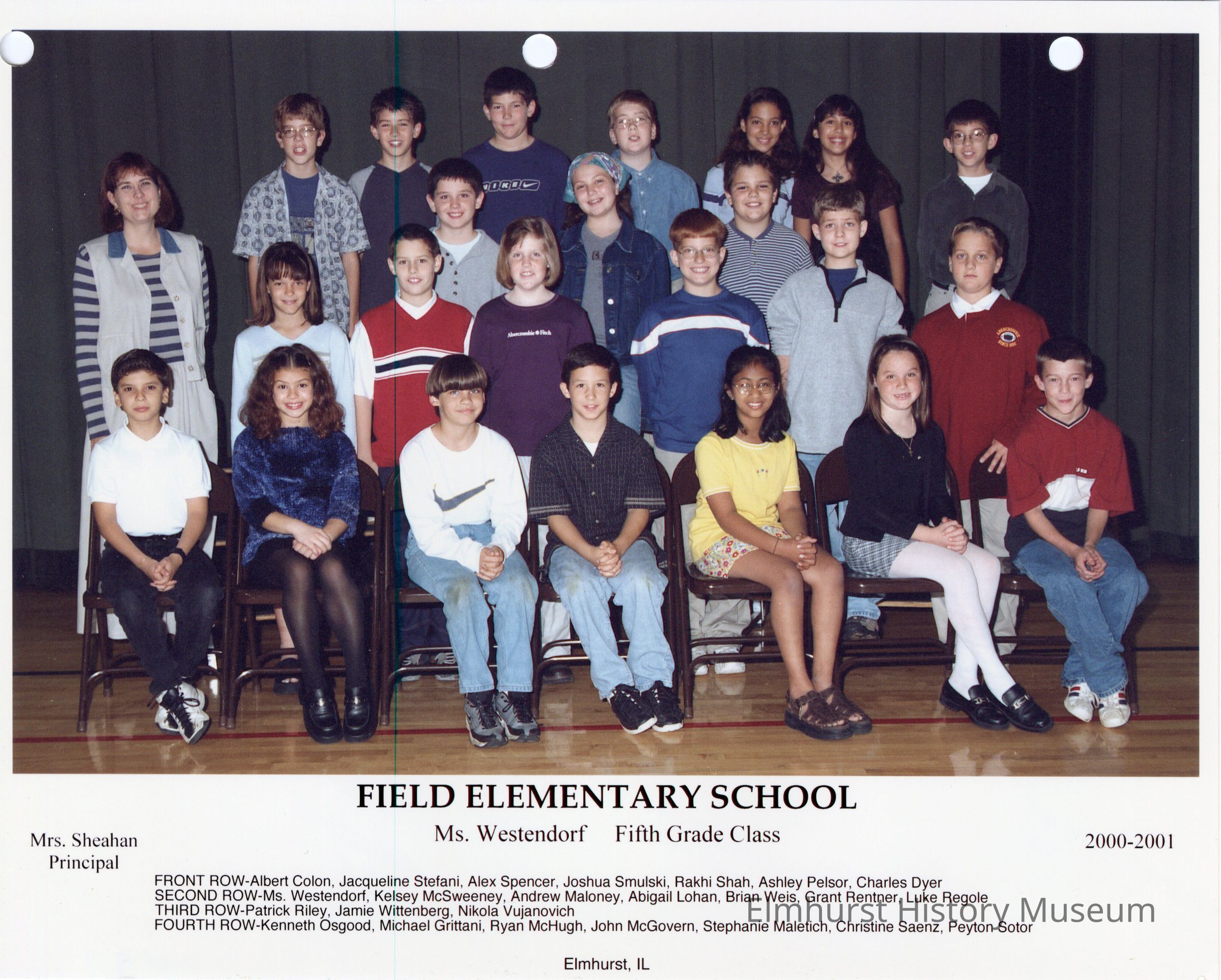 Fifth grade class photograph from Field Elementary School, under teacher Ms. Westendorf. Student names are listed at the bottom of the photograph.Photograph Details