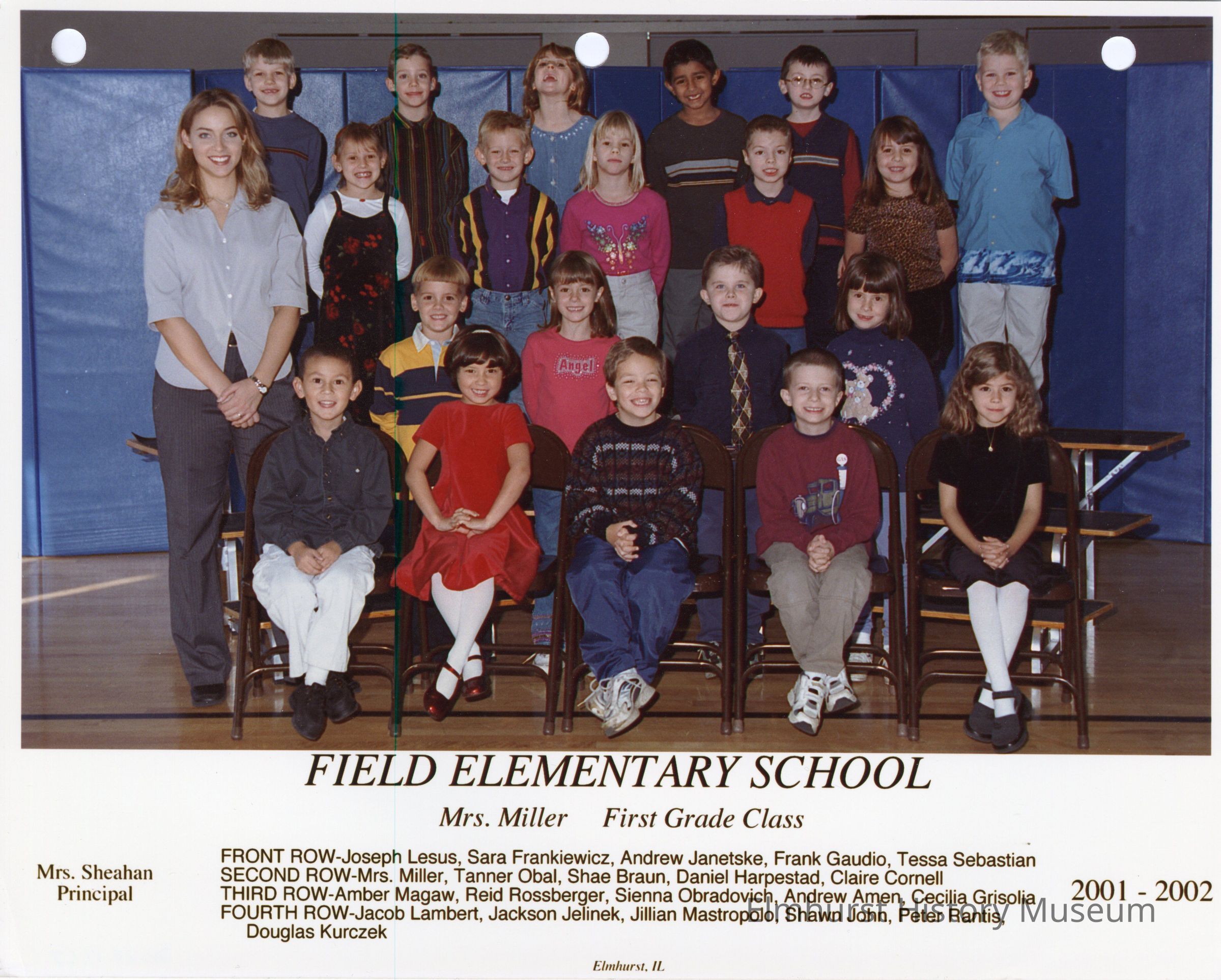 First grade class photograph from Field Elementary School, under teacher Mrs. Miller. Student names are listed at the bottom of the photograph.Photograph Details
