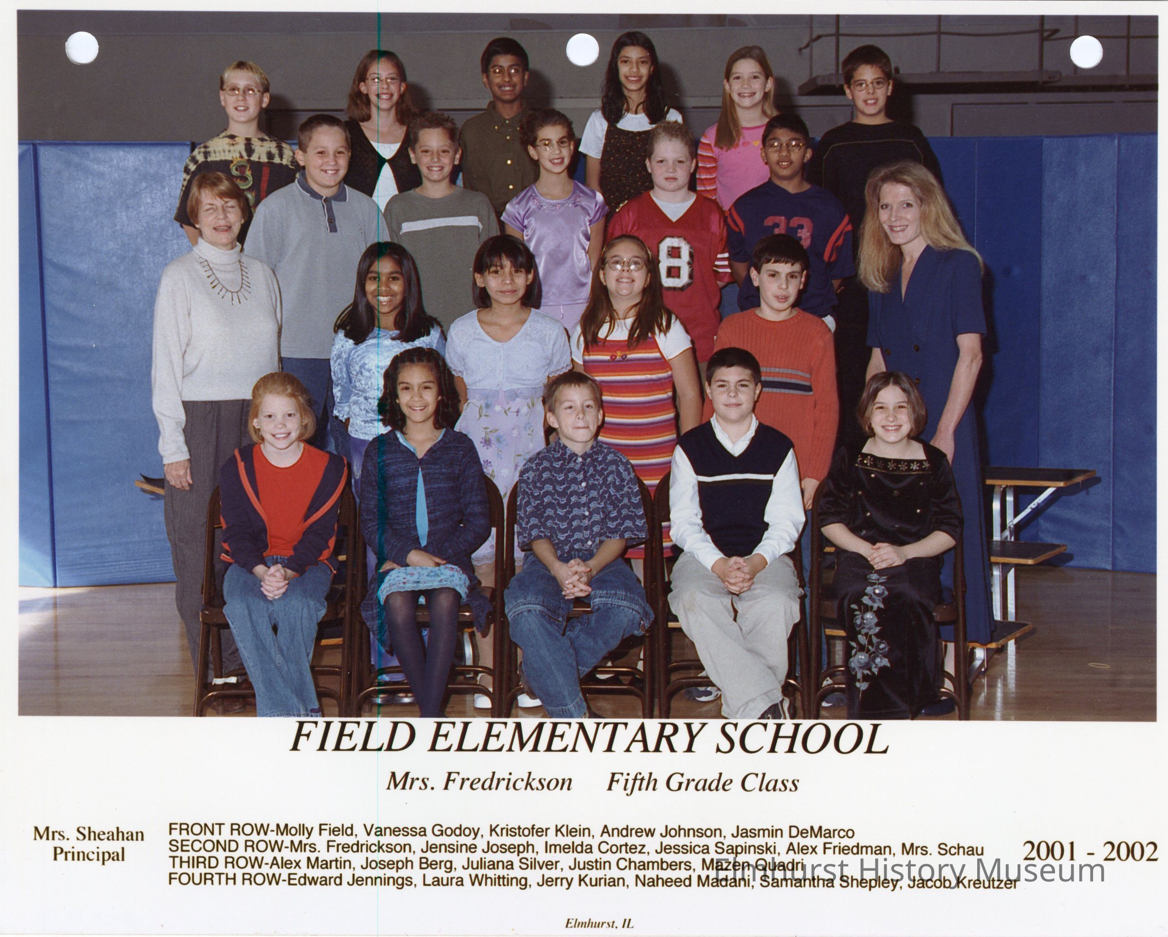 Fifth grade class photograph from Field Elementary School, under teacher Mrs. Frederickson. Student names are listed at the bottom of the photograph.Photograph Details
