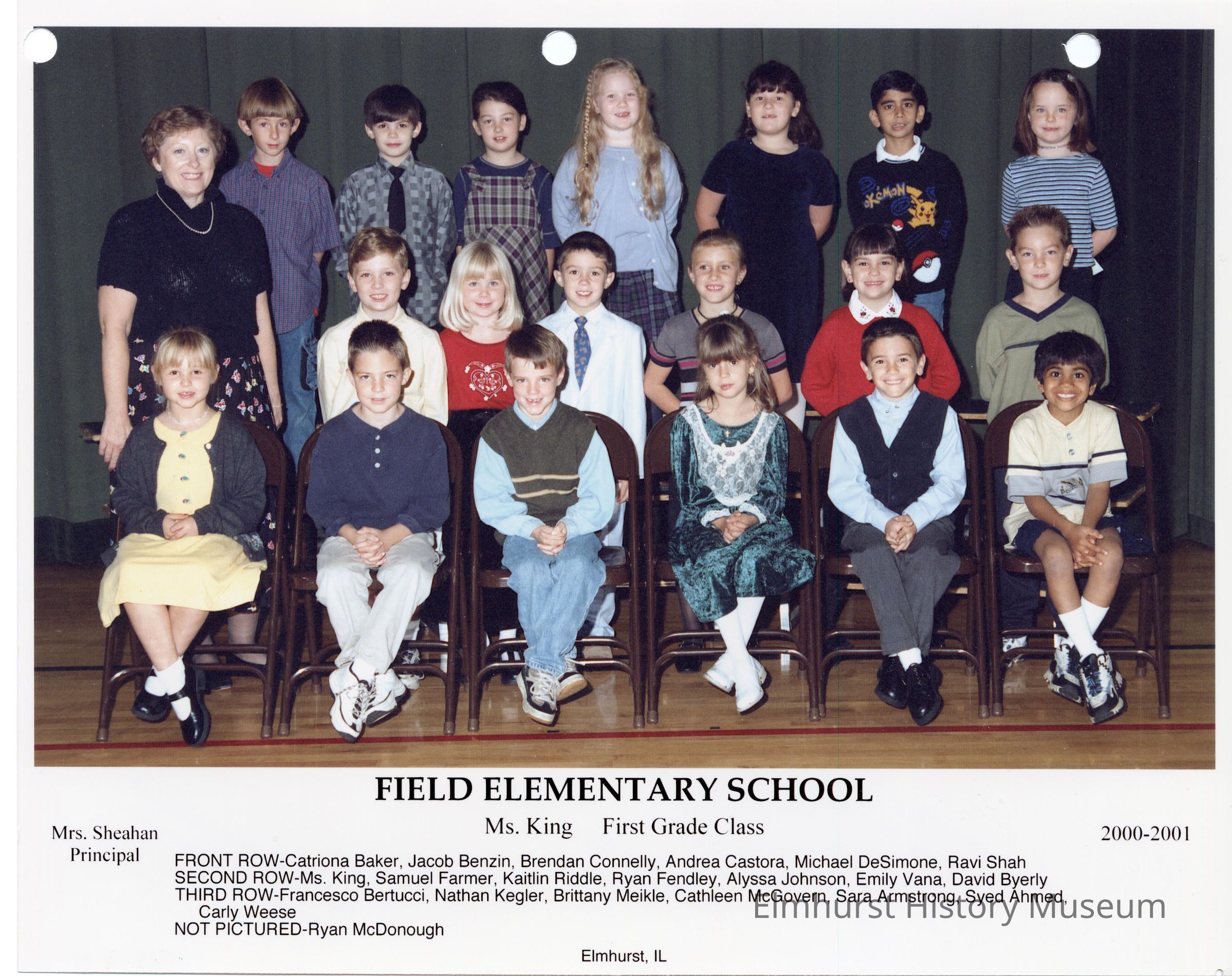 First grade class photograph from Field Elementary School, under teacher Ms. King. Student names are listed at the bottom of the photograph.Photograph Details