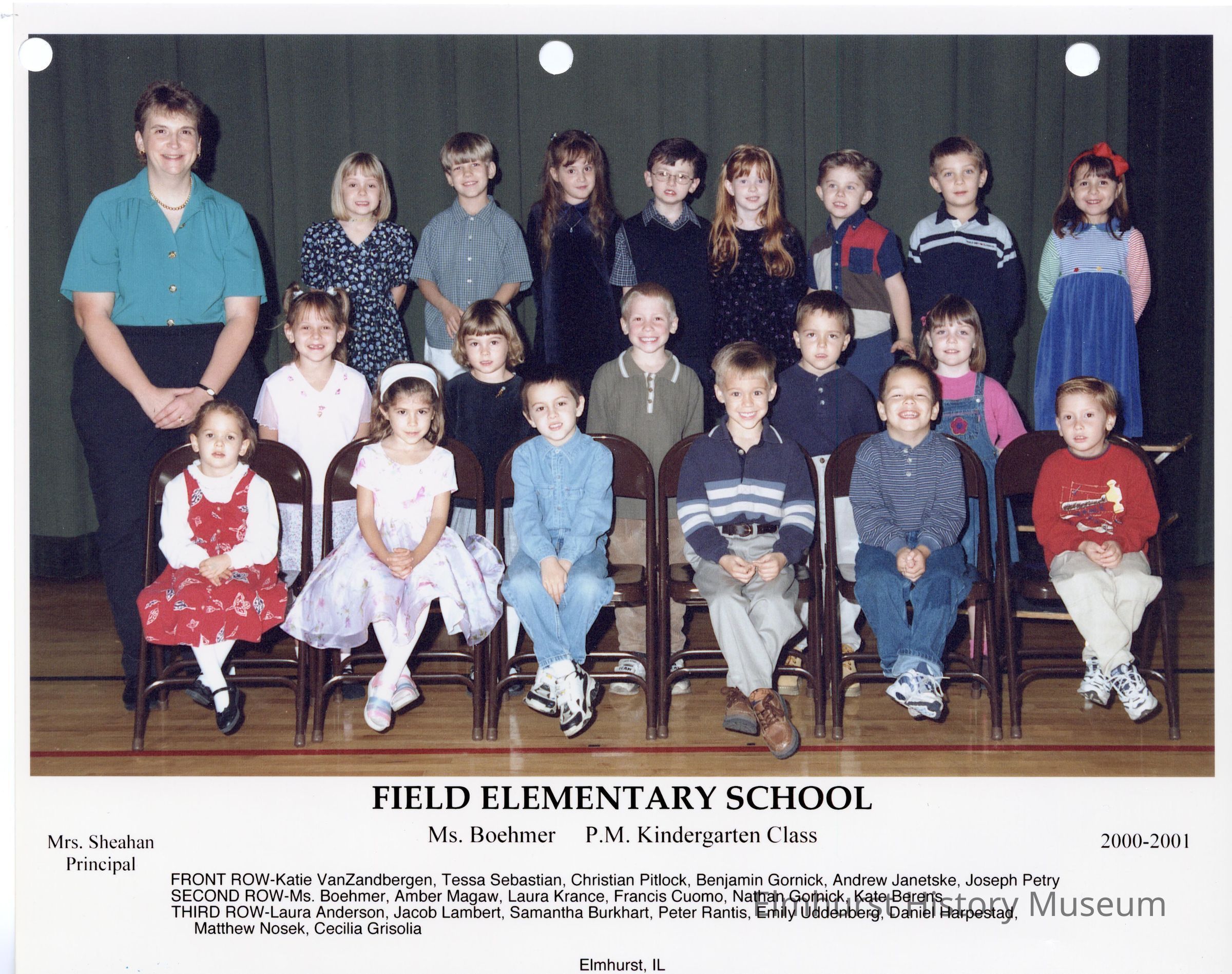Kindergarten class photograph from Field Elementary School, under teacher Ms. Boehmer. Student names are listed at the bottom of the photograph.Photograph Details