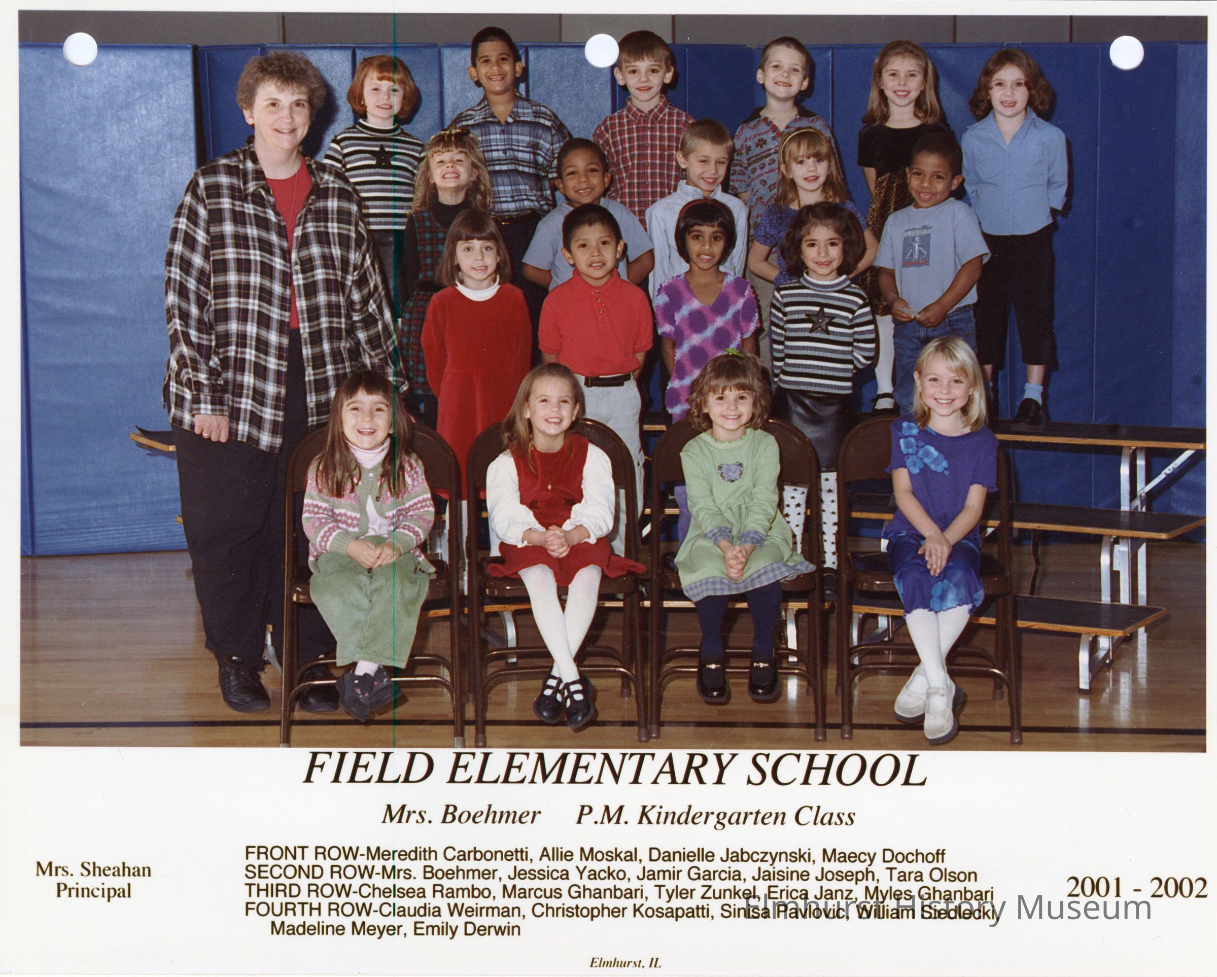 Kindergarten class photograph from Field Elementary School, under teacher Mrs. Boehmer. Student names are listed at the bottom of the photograph.Photograph Details