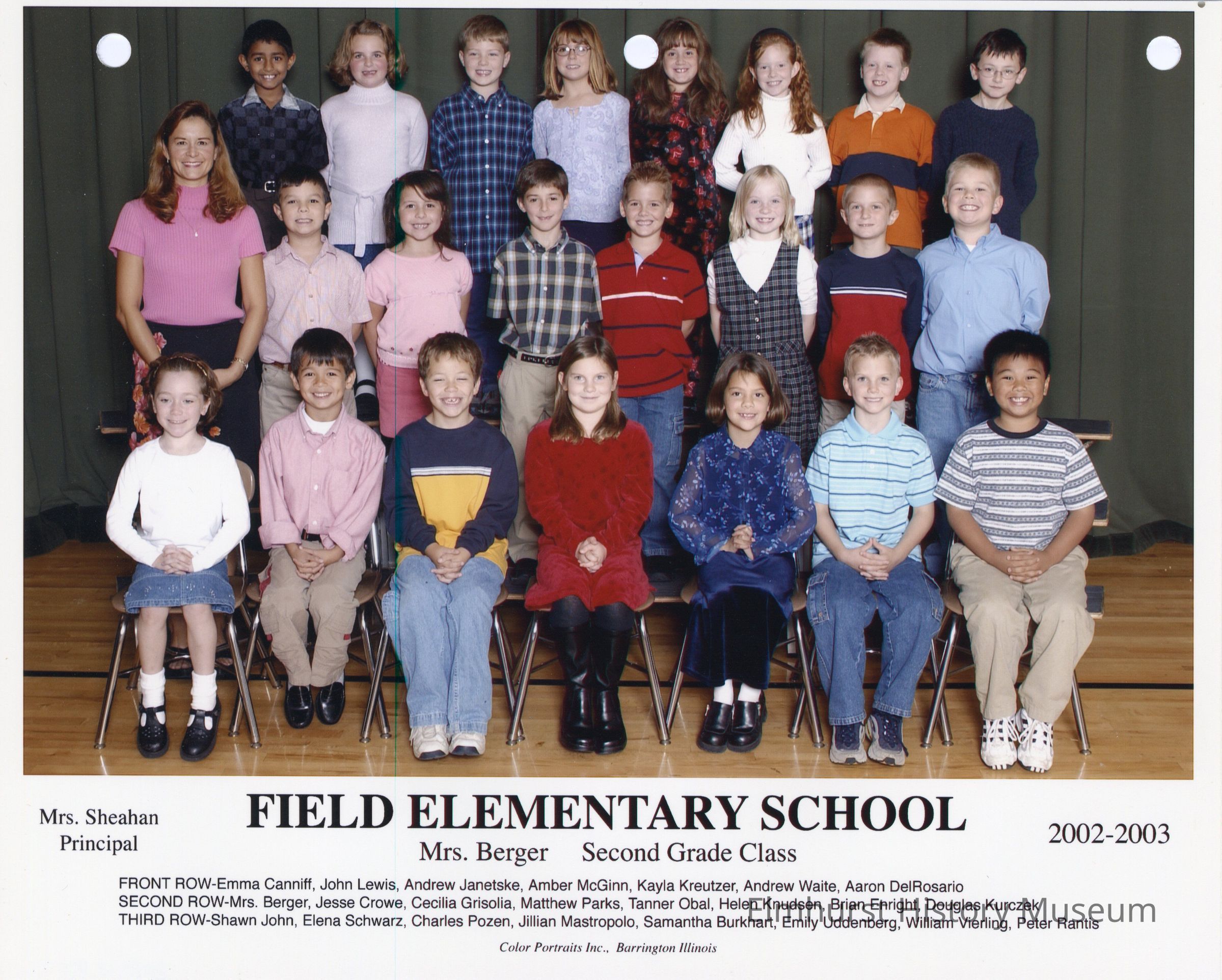 Second grade class photograph from Field Elementary School, under teacher Mrs. Berger. Student names are listed at the bottom of the photograph.Photograph Details