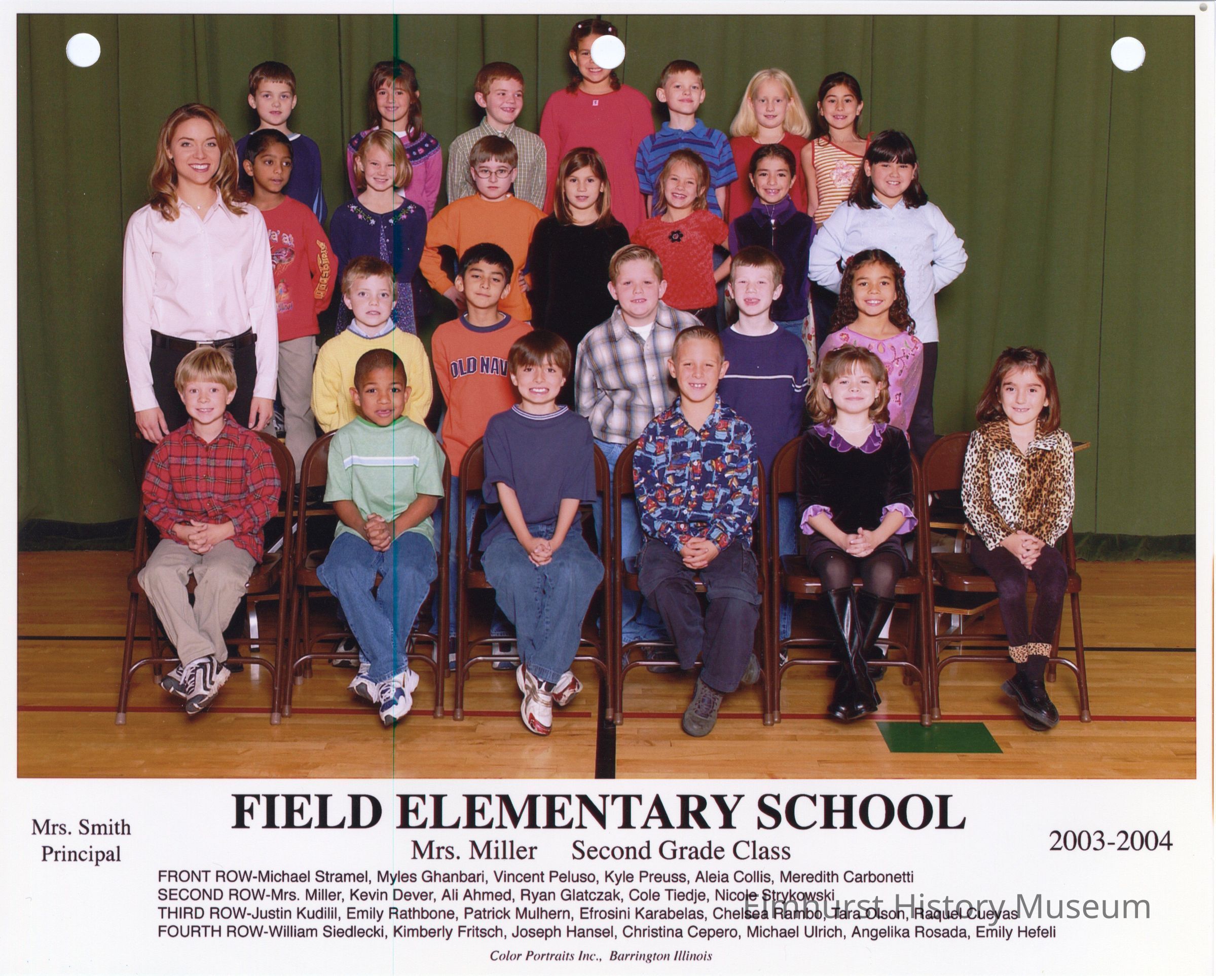 Second grade class photograph from Field Elementary School, under teacher Mrs. Miller. Student names are listed at the bottom of the photograph.Photograph Details