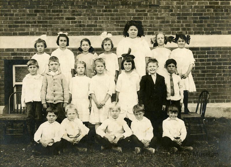 Group photo of a class that was moved from Hawthorne School following the fire that destroyed the building in December 1917. They attended class in a hallway at Field for the remainder of the school year.Photograph Details