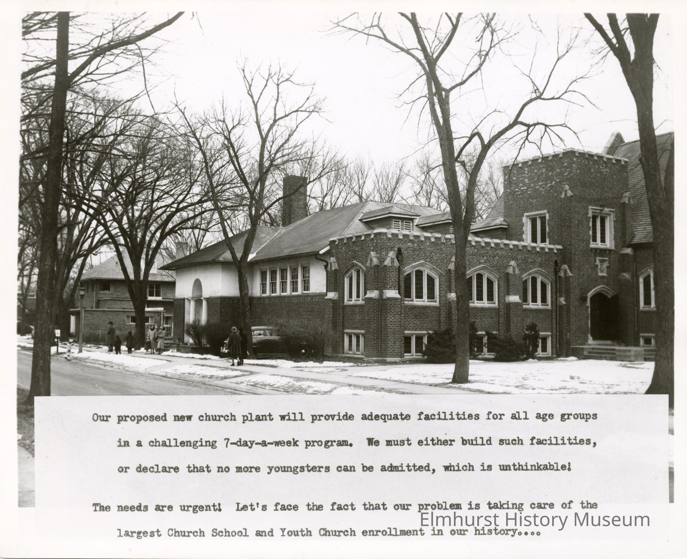 View of the First Congregational Church of Elmhurst community house at 235 S. Kenilworth Avenue. Text describes the need for a larger facility.Photograph Details