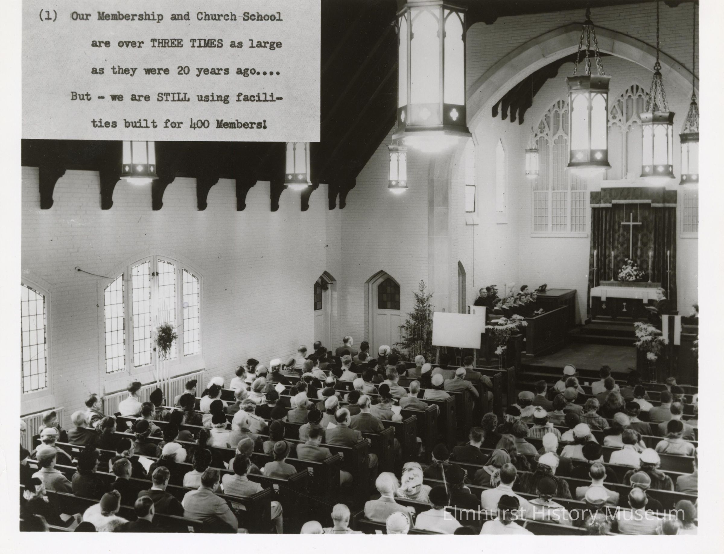 Interior view of the First Congregational Church of Elmhurst at 235 S. Kenilworth Avenue. Pictured text was part of a lobby to expand and renovate the church in the late 1960s.Photograph Details