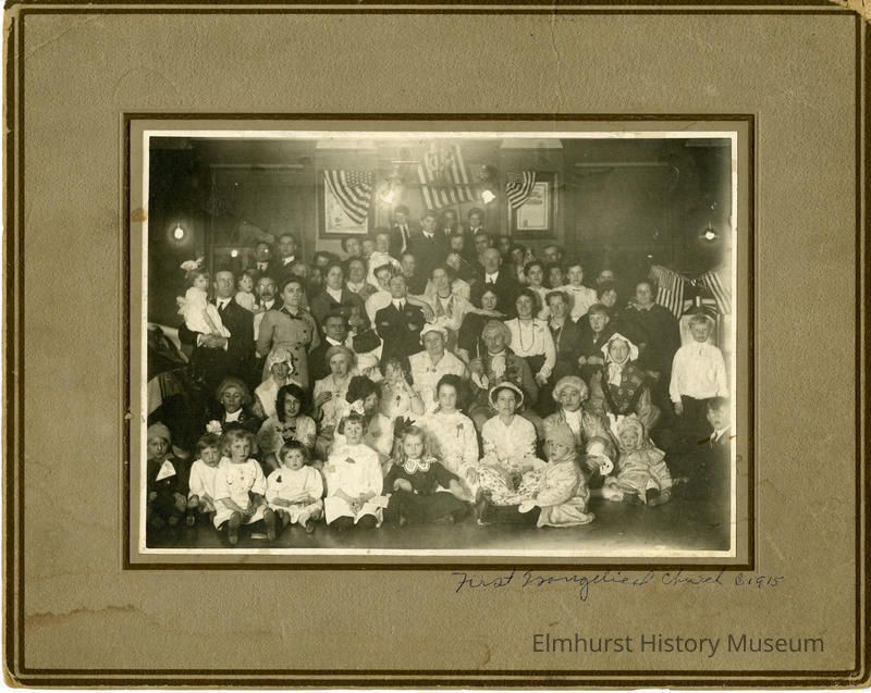 Sepia toned photo; First Evangelical Church Congregation, dressing in pioneer costume.Photograph Details