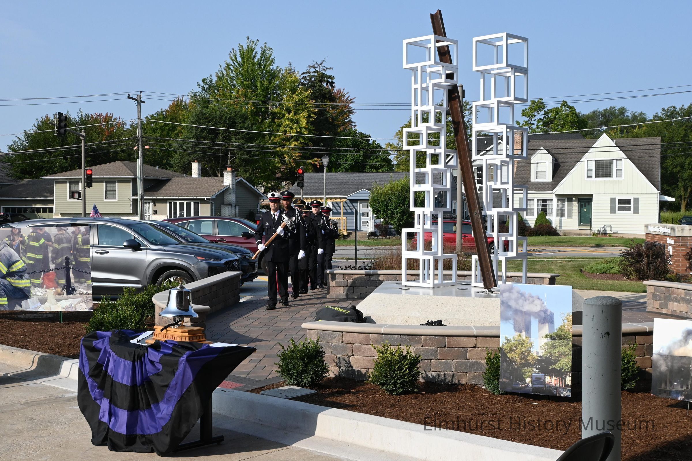 Fire department color guard marches at the dedication ceremony for the First Responders Memorial at Fire Station No. 2 at 605 S. York Street.Photograph Details
