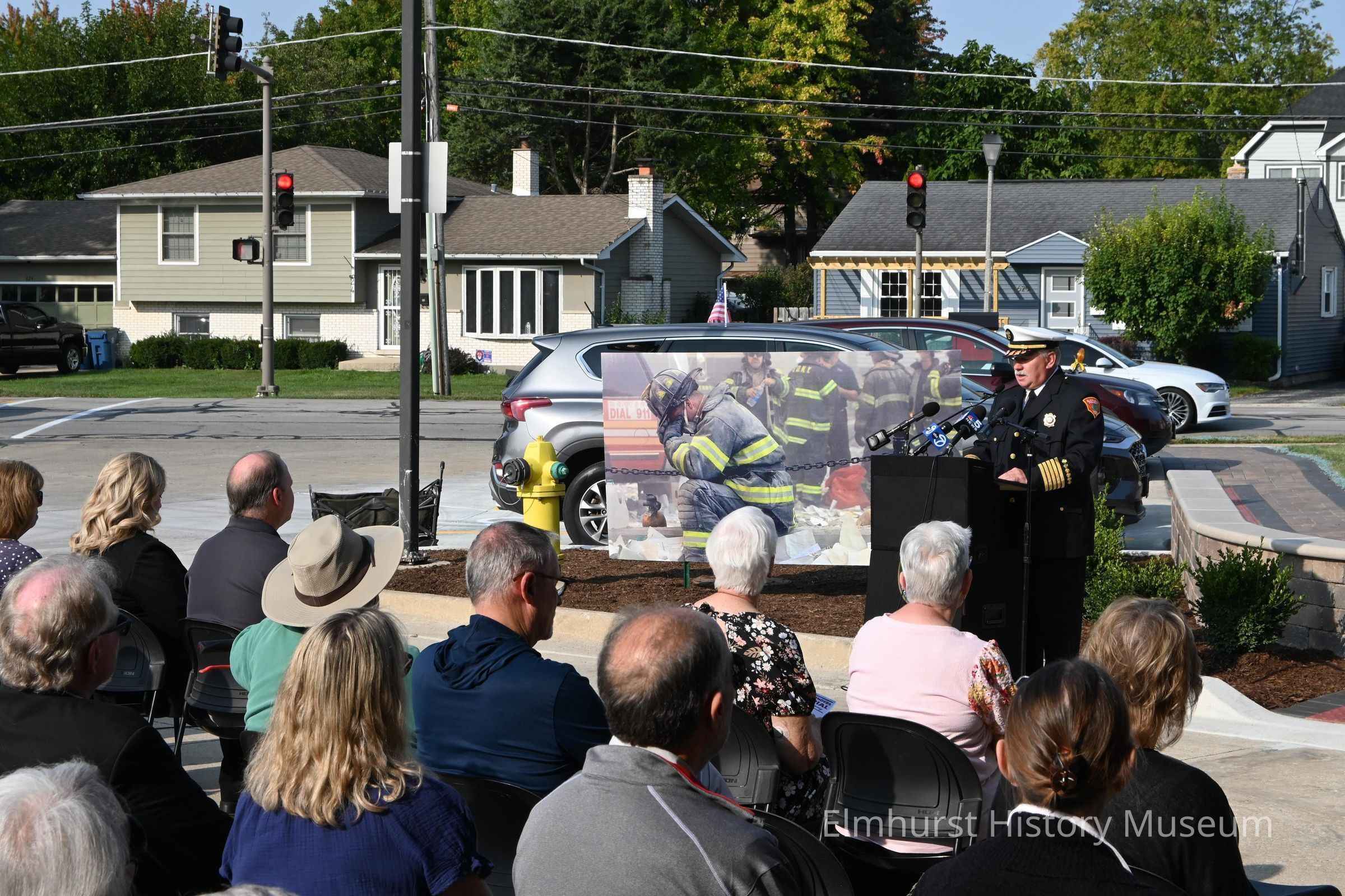 Fire Chief Dick Dufort speaks at the dedication ceremony for the First Responders Memorial at Fire Station No. 2 at 605 S. York Street.Photograph Details
