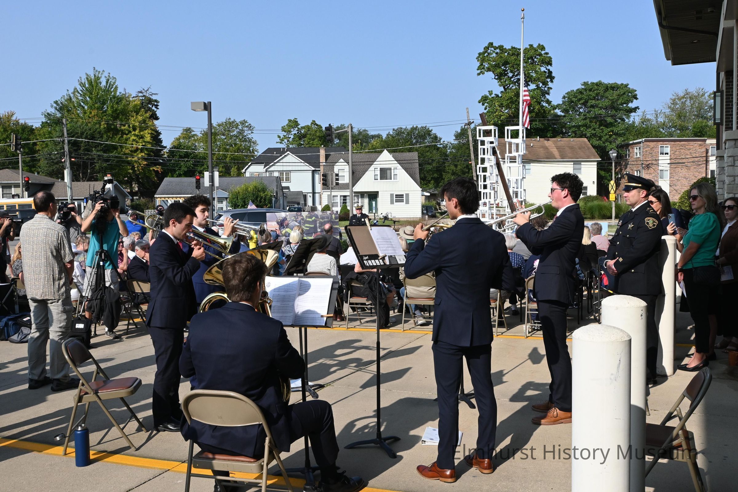 The York Community High School Brass Quartet plays at the dedication ceremony for the First Responders Memorial at Fire Station No. 2 at 605 S. York Street.Photograph Details
