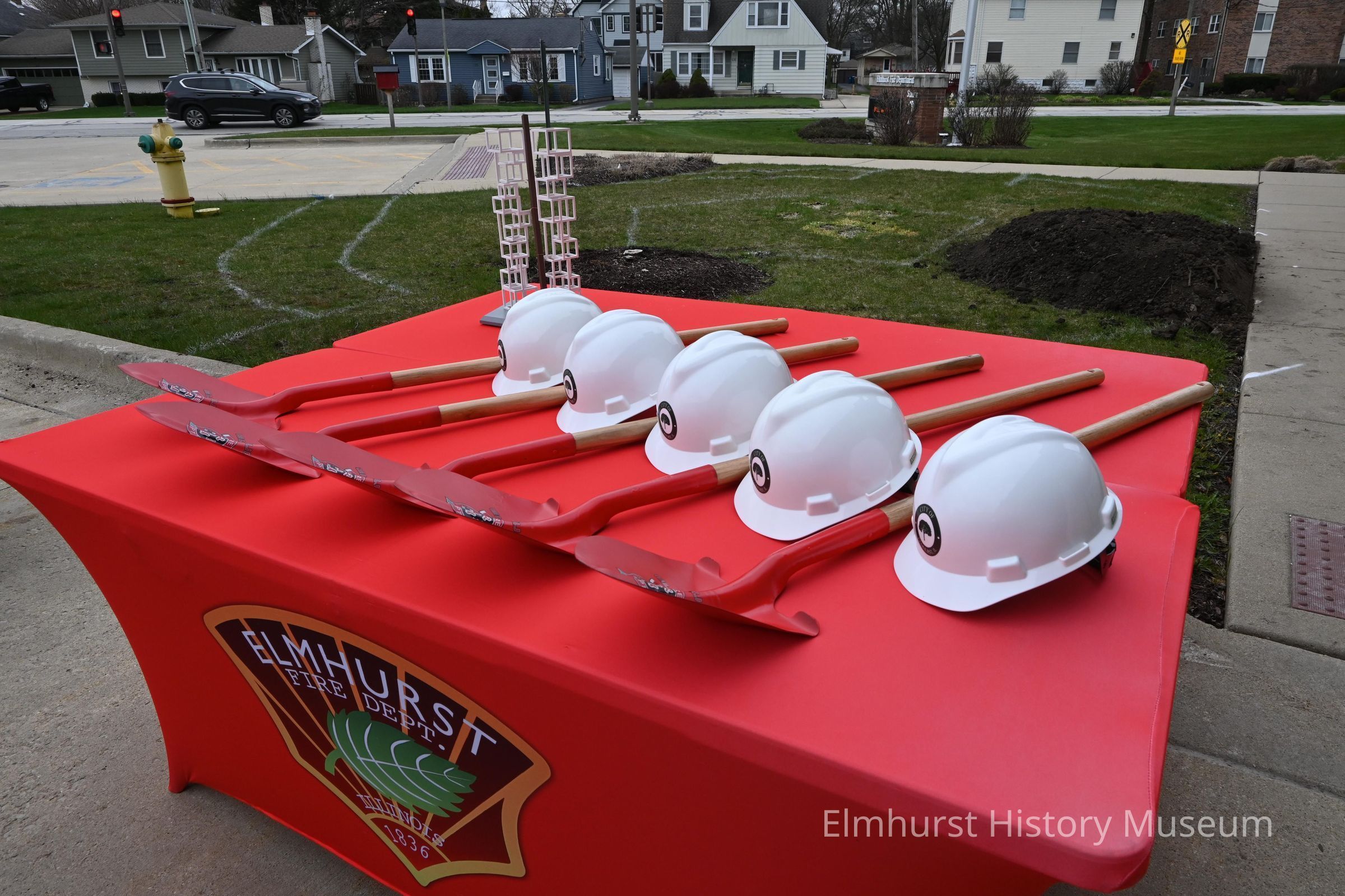 Ceremonial shovels and maquette sculpture displayed at the groundbreaking ceremony for First Responders Memorial Plaza at Fire Station 2 at 605 S. York Street.Photograph Details
