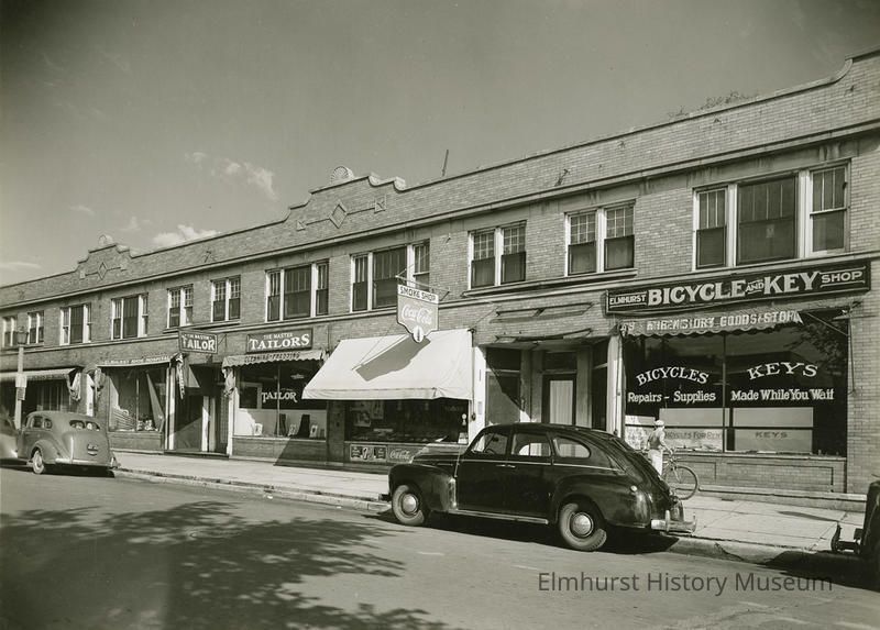 Identification typed on back at top: Photograph taken by Vernon Hart of Kaufman & Fabry Co., 425 S. Wabash Ave. Chicago, Ill / Monday morning Sept. 10, 1945 / West First St., Elmhurst, Ill / Left to Right: / 117 Annex to Cottage Hill Cafe / 115 Elmhurst Shoe Hospital (Wm. Dunitz) / 113 master Tailor / 111 Smoke Shop / 107 Elmhurst Bicycle & Key Shop Photograph credit: Kaufmann & Fabry Co., / Chicago Notation: from Ted Kross 1975
