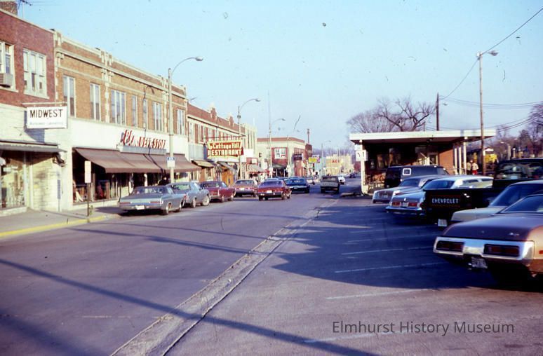 W. First Street looking east towards N. York Street. The Chicago and North Western station is on the right.Photograph Details