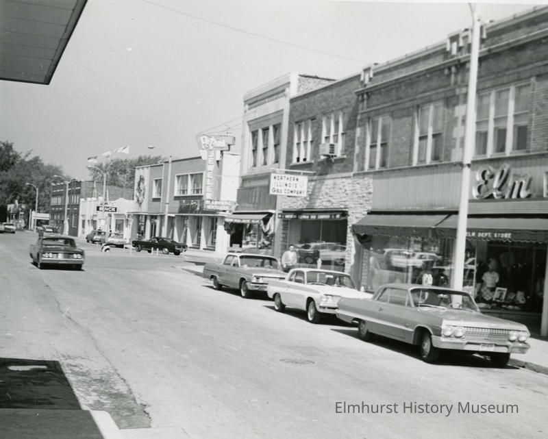 Stamped on back: Elmhurst / Historical / Commission Noted: First St. West from Northwestern Depot / Taken May 26, 1966 by R.L. Mahon / (photo details)
