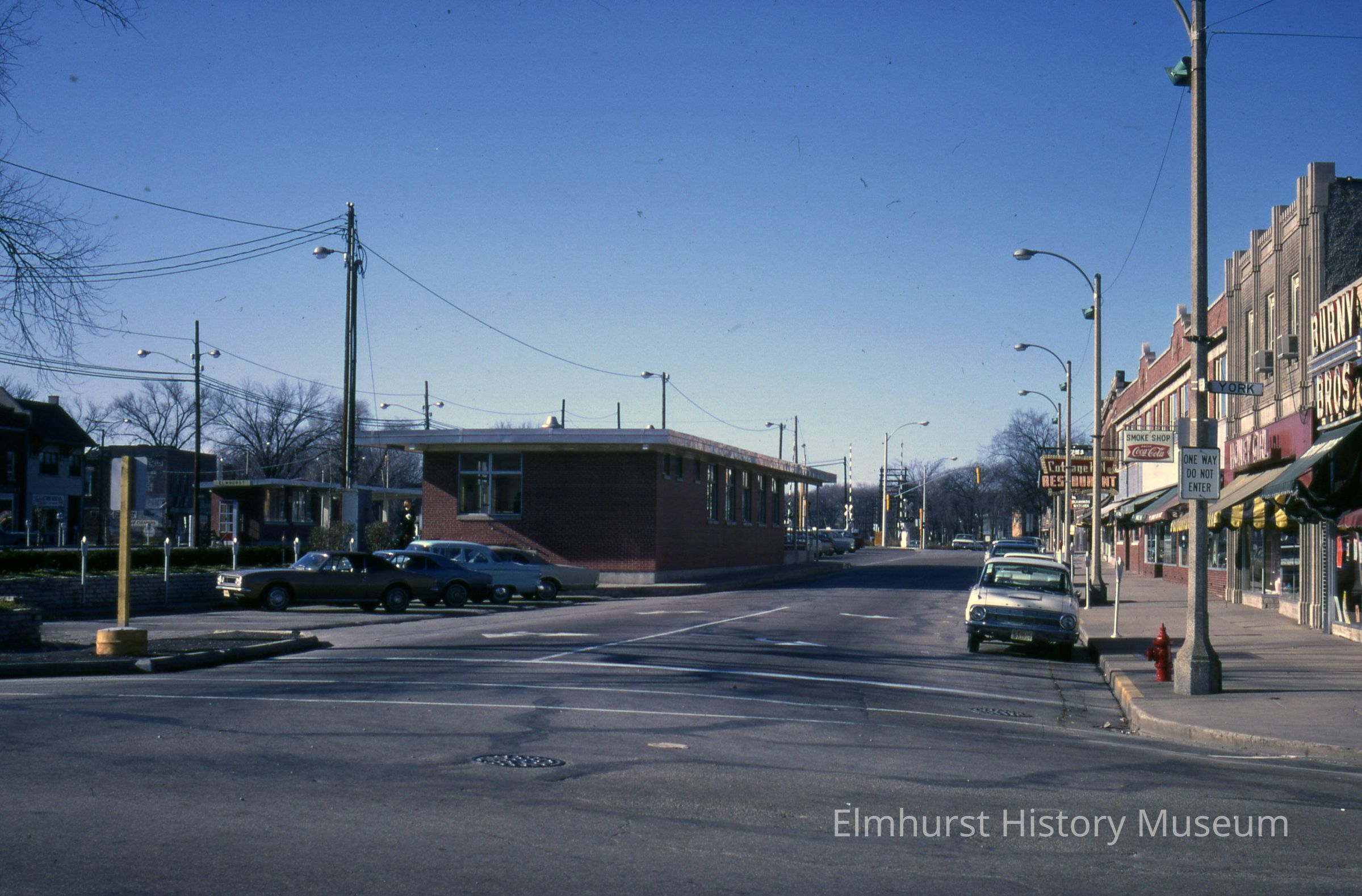 First Street looking west from N. York Street. The Chicago & North Western train depot is at center.Photograph Details