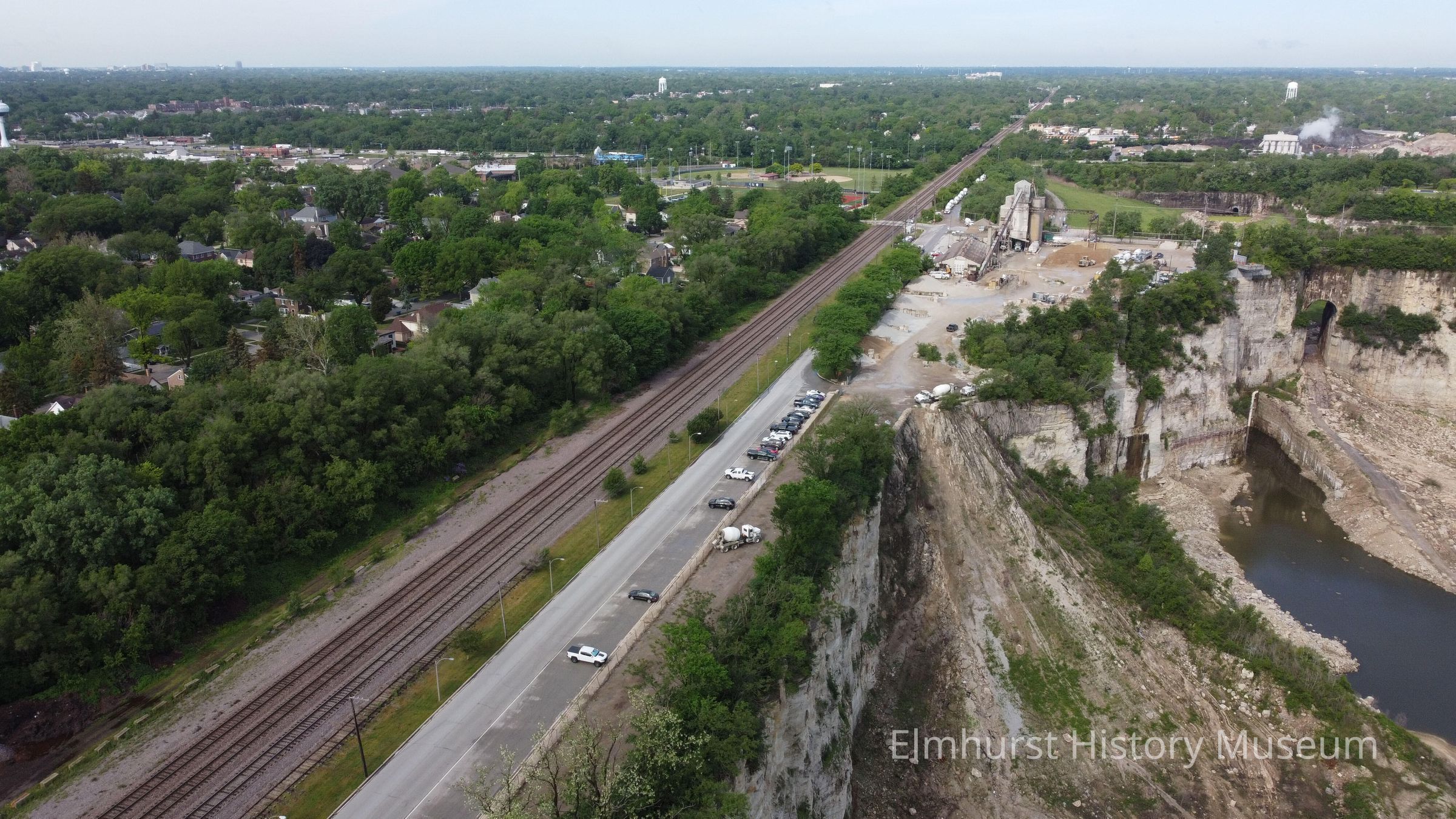 Aerial view of First Street running west past the Elmhurst-Chicago Stone Quarry and the Elmhurst Quarry Flood Control FacilityPhotograph Details