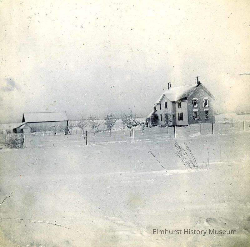 Snow scene of Fischer Farm on Grand Avenue.