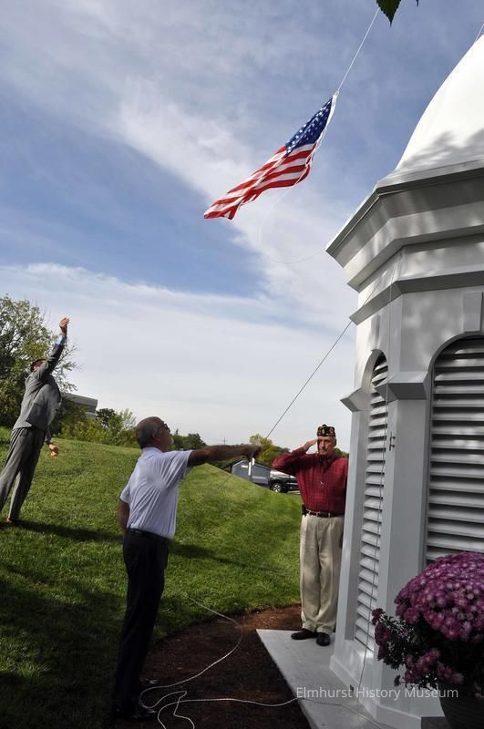 Alderman Mark Mulliner and T.H.B. Post 187 Seargent-at-Arms Bill Shanklin conduct a flag raising at the restored Elmhurst Memorial Hospital Cupola at Elmhurst Community Bank at 330 W. Butterfield Road.Photograph Details