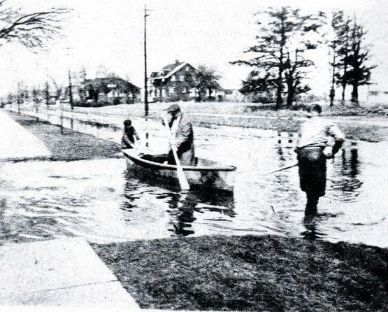 Walter and John Weiser ferrying pharmacist William Mahler across flooded Church Street, on the west side of Arlington, after a tornado touched down in Melrose ParkPhotograph Details