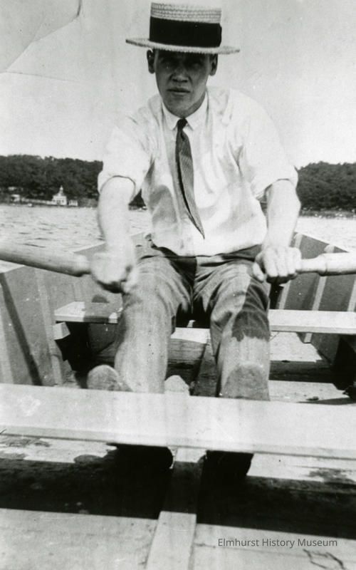 Waldo Hansen, wearing straw hat and a tie, is pictured in a boat on Salt Creek at flood stage in the early 1920s.Inscription/Signature/Marks