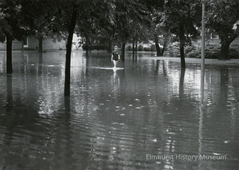 Kristen Kohler walking on a flooded street in Elmhurst following a Salt Creek floodPhotograph Details