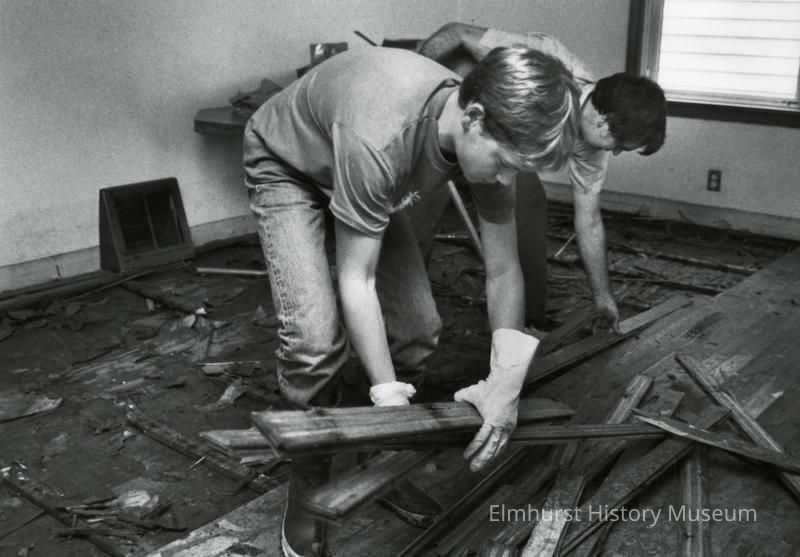 Stamped on the back: Press Publications/News Photo/Staff photo by/Irene Brady/Aug 26, 1987. Hand-written on the back: Charlie McGee, left, and Stan Zielinski, volunteers of Visitation Church inside home of James Brezina, 1029 Spring Road following flood of 1987.