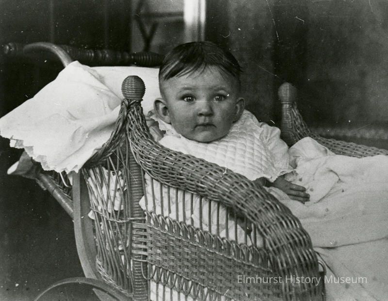 Snapshot of five-month-old Florence Fischer (1901-1975) seated in a wicker baby carriage.Photograph Details