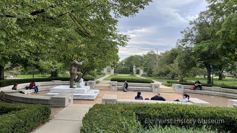 Founders Commons on the grounds of Elmhurst University. The Reinhold Niebuhr sculpture is at left.Photograph Details