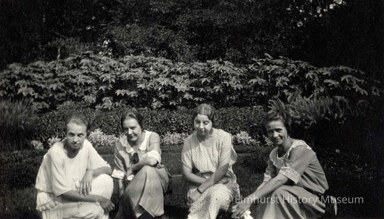 Four women pose for a photograph in a garden, possibly Wilder Park. The woman second from right is Laura Schumacher Raab.Photograph Details