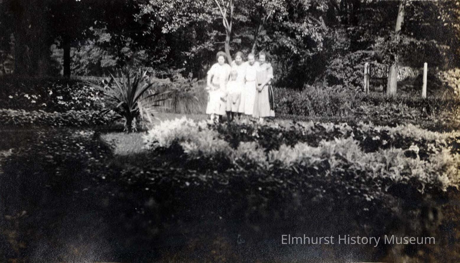 Four young women pose for a photo in a garden, possibly Wilder Park. Woman second from left is Laura Schumacher Raab.Photograph Details