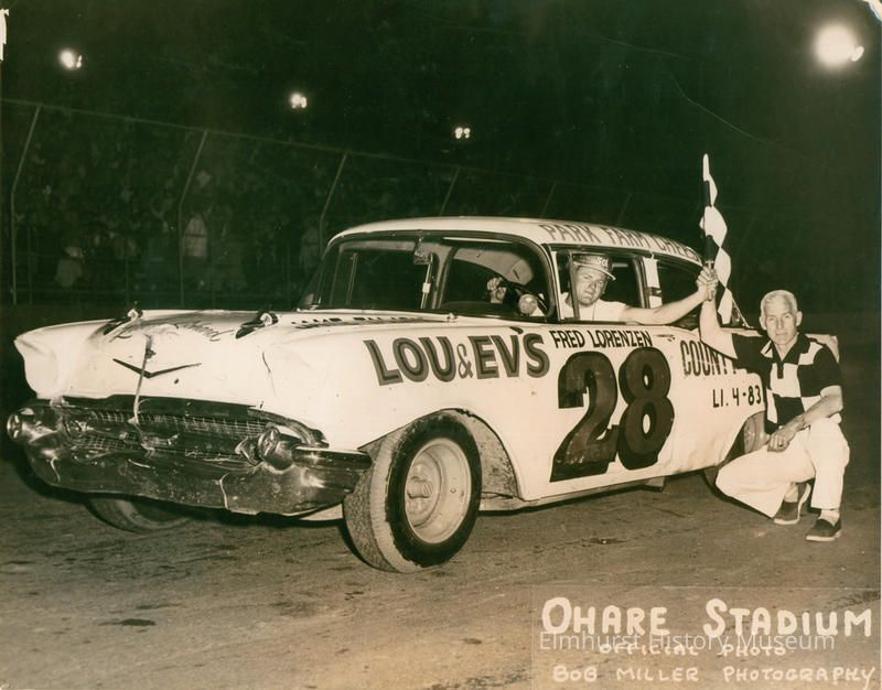 Printed on piece of lined notebook paper taped to back: In 1957 Park Farm Cheese Mfg. Co. sponsored Fred Lorenzen's stock car along with "Lou & Ev's County Line Pizza." (Note the name on the roof). The car is a 1957 Chevrolet. Photography credit in lower right corner: O'Hare Stadium Official Photo / Bob Miller Photography
