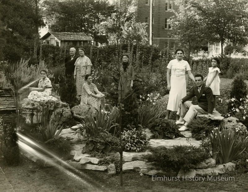 Inked on the reverse of imae: Mr. & Mrs. Fred Harbour & family in rock garden at 229 Cottage Hill where they lived for 27 years (photo 1939-house razed 1953) / Edith-Mr. Harbour-Mrs. Harbour-Virginia-Josephine-Marjorie-Irving-Delphine