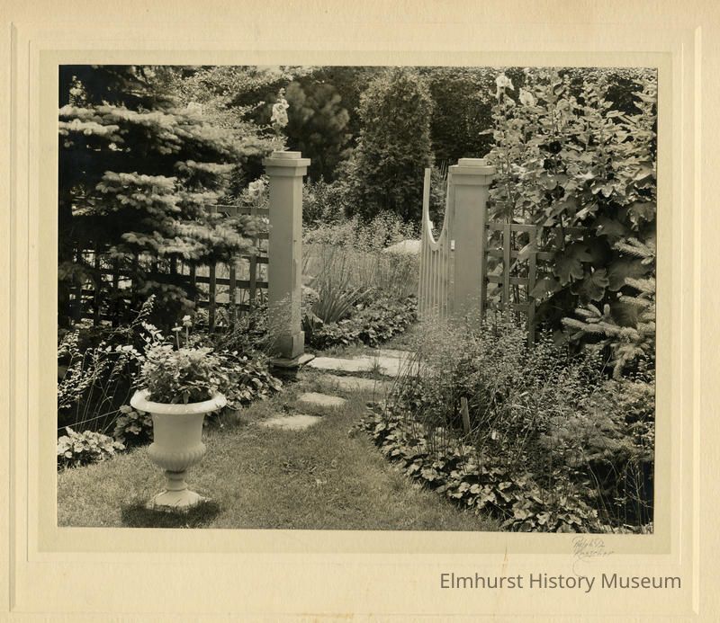 Written at bottom of mat: Mother's garden - 159 Cottage Hill - Elmhurst, Ill 1938 Printed in lower right corner of image (photographer credit): Ralph M / Kroscher