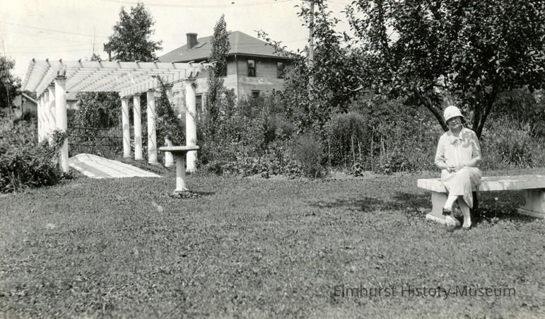 Handwritten on back: Pearl in rear of yard under an apple tree - you can get the distance by looking at Picture #1 & see the bench and just a part of the pergola - all the snaps, we think are very good. Stamped on back: Elmhurst Historical Commission