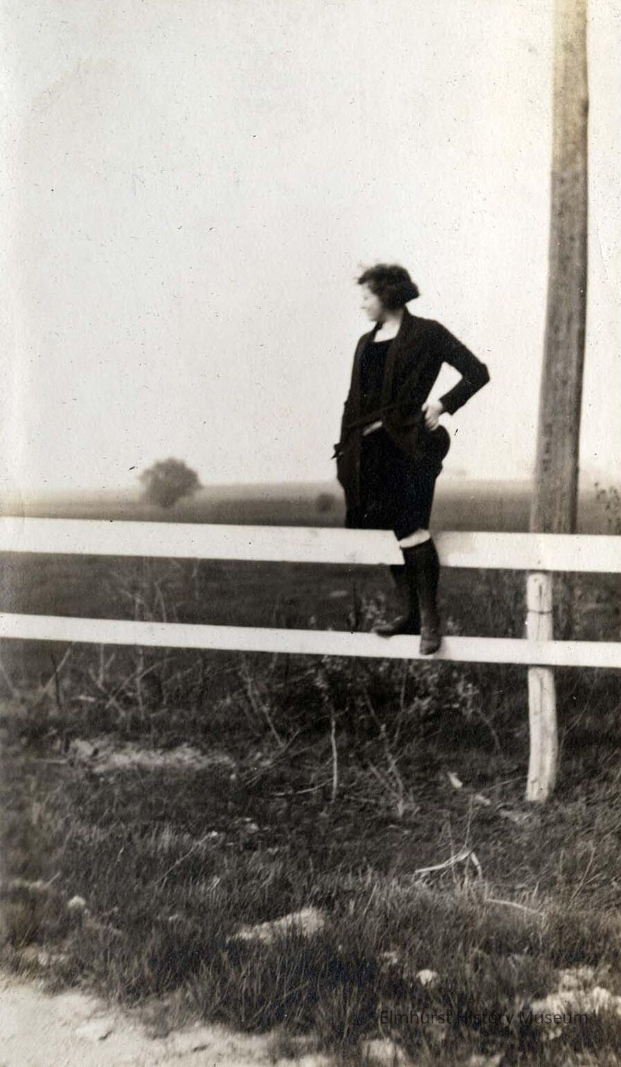 A young woman posing for a photo while straddling a fence with an empty field in the background.Photograph Details