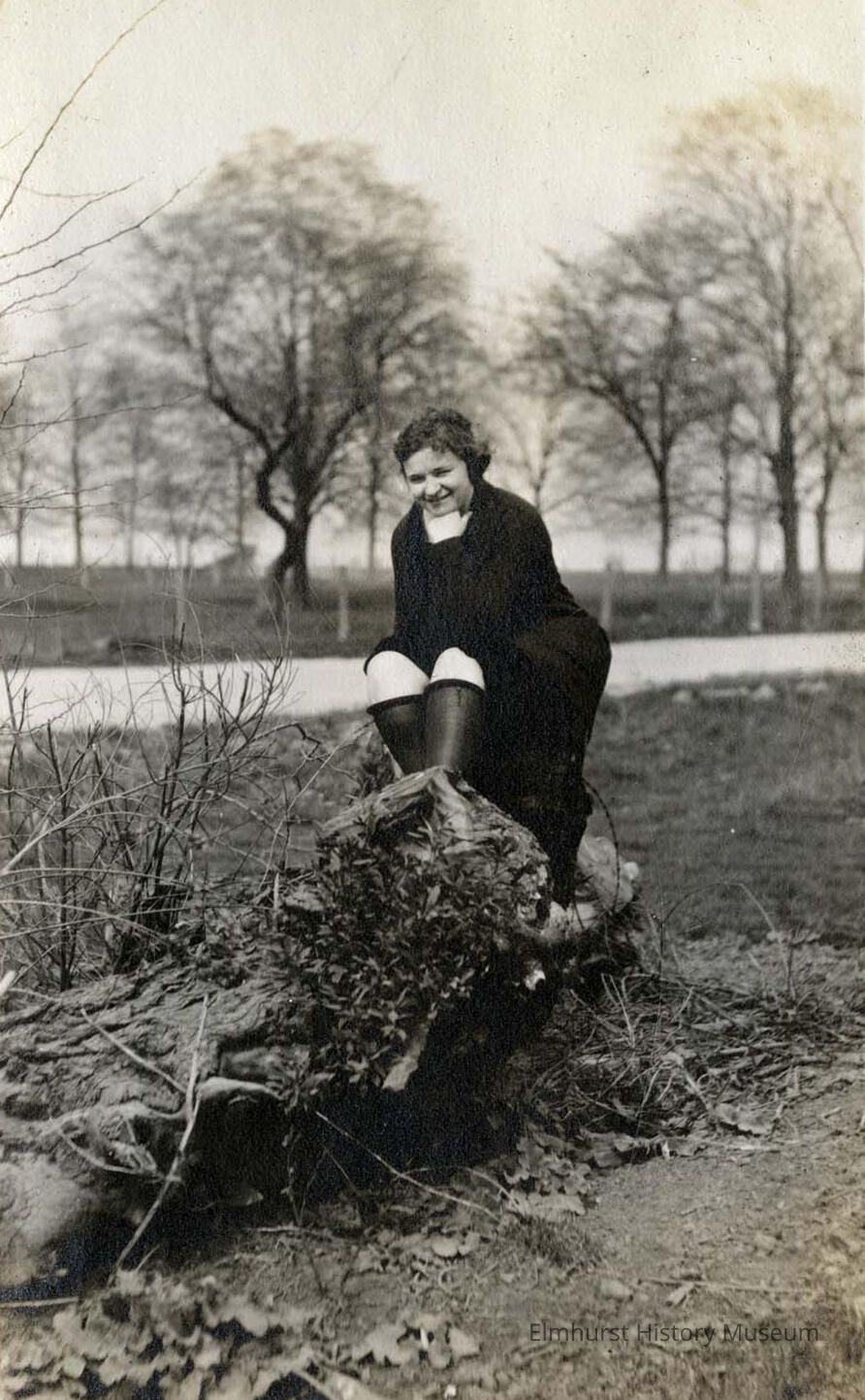 A young woman poses for a photo while sitting on a stump with a road in the background (possibly North Ave).Photograph Details