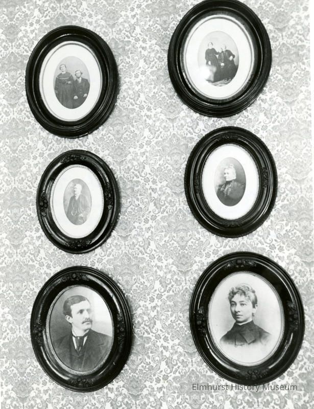 Six framed oval photographs of the Glos and Schween families hanging on a wall in the Elmhurst Historical Museum's Old Elmhurst Room.Photograph Details