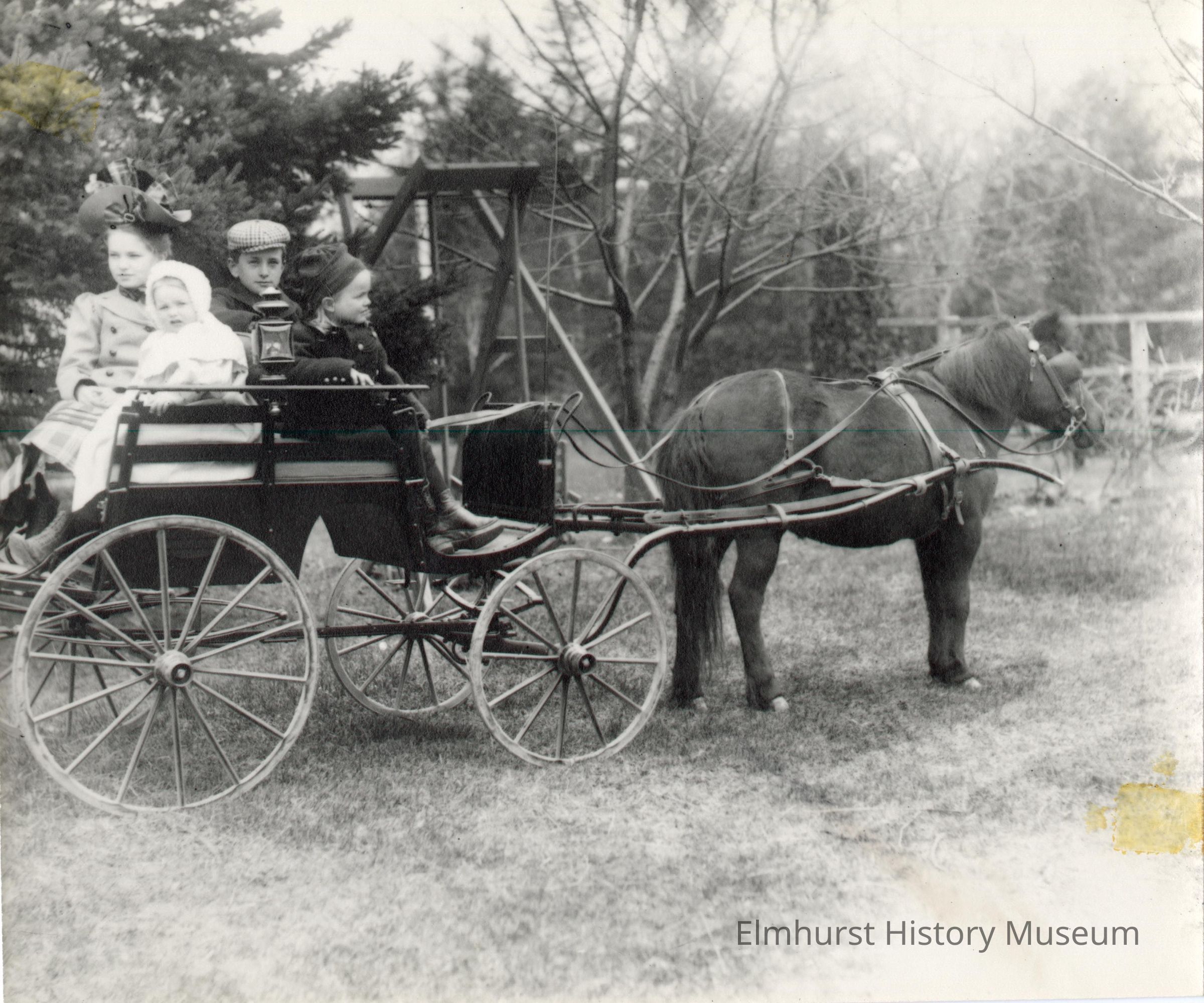 Siblings Clara, Mabelle, Albert, and Walter Glos, children of Emma and Jacob Glos, on a carriage outside of 118 Virginia Street.Photograph Details