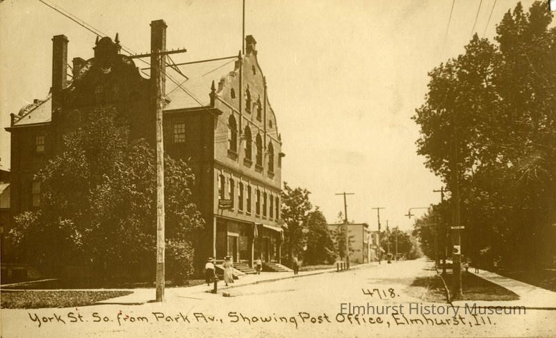 On reverse of image: Glos Bldg about 1895-1900 / Glos Hall on top floor On bottom front: 4718 Bottom right corner: York St. So. from Park Av., Showing Post Office, Elmhurst, Ill.