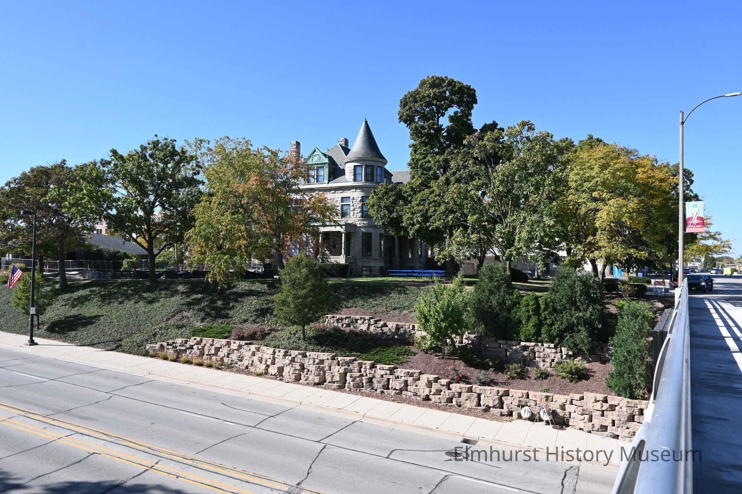 The Elmhurst History Museum in the Glos Mansion at 120 E. Park Avenue, viewed from the E. Park Avenue bridge.Photograph Details
