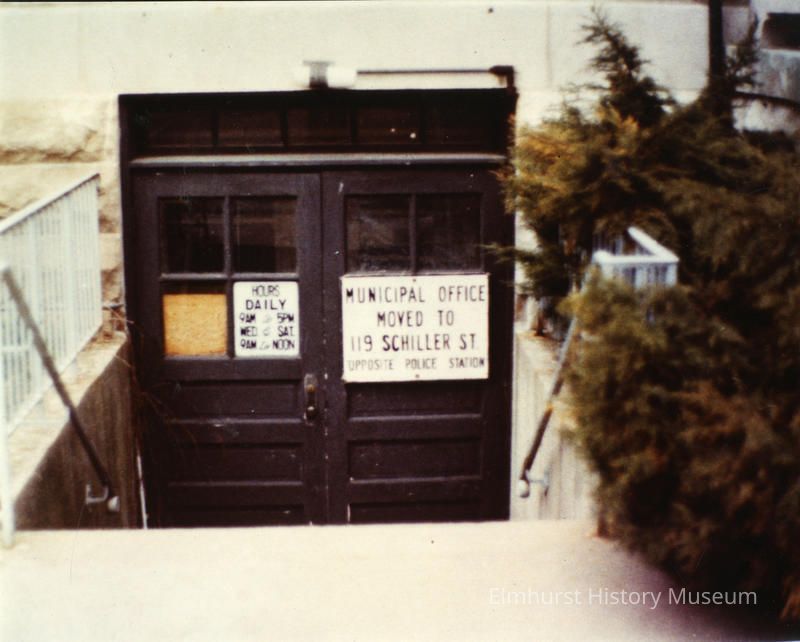 Basement Doors of Glos Mansion, shortly after City Hall was moved to 119 Schiller. There is a sign directing visitors to the new location.Photograph Details