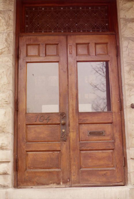 Each photo in this accession is taped to a note card with typed description. This one reads: Double doors of the main entrance. Note the large windows, and door mailbox. Also the famous address 104 S. Kenilworth