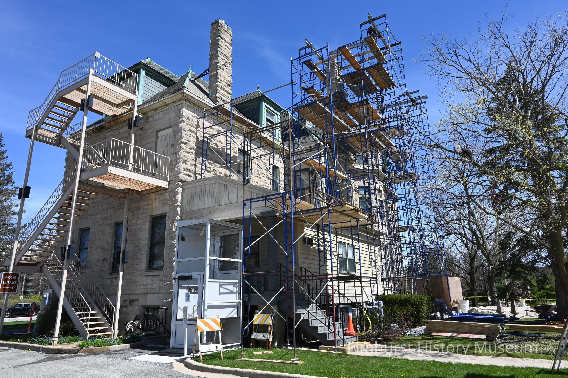 Workers build scaffolding on the south facade of the Glos Mansion to reconstruct and restore the building's chimneys.Photograph Details