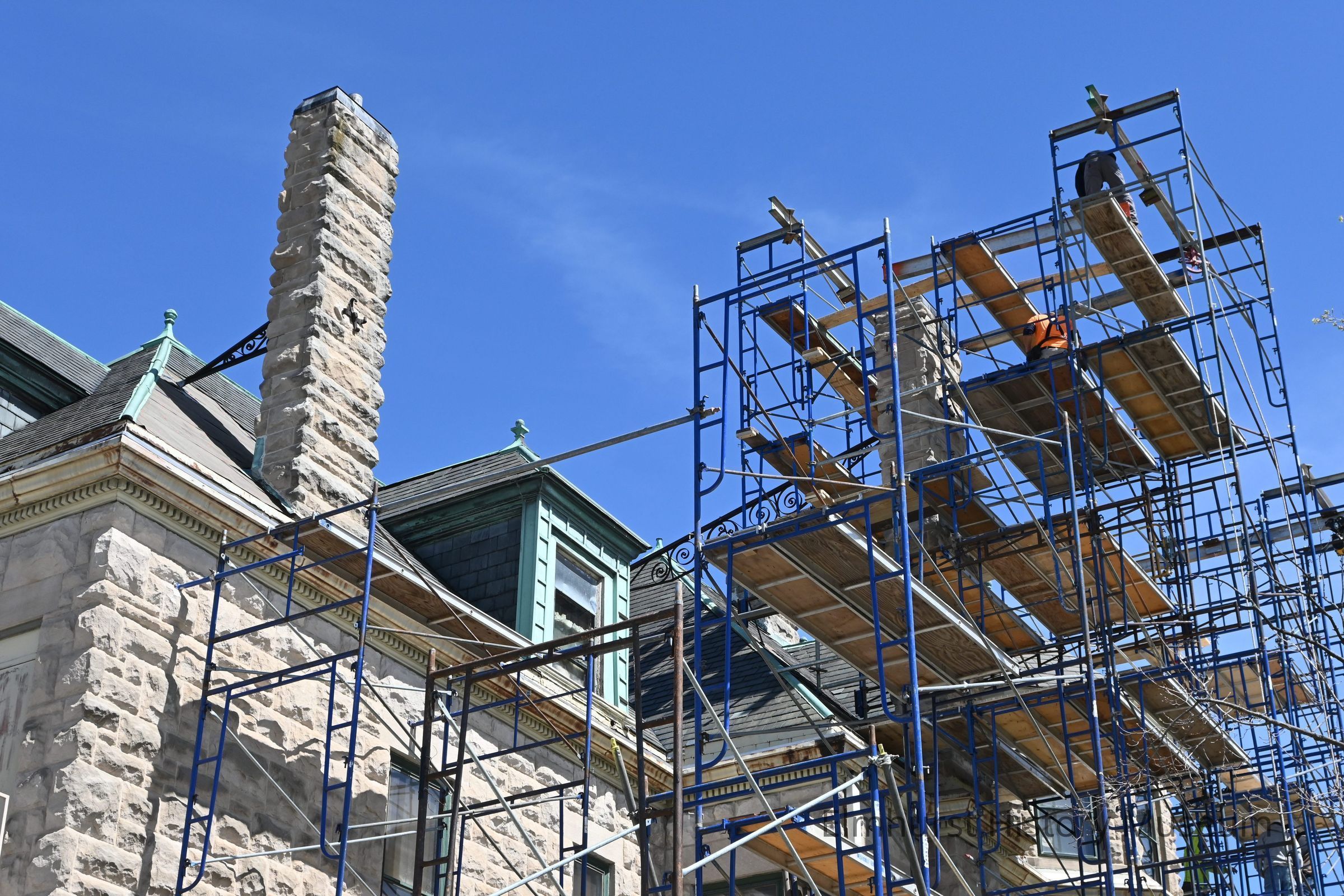 Workers build scaffolding on the south facade of the Glos Mansion to reconstruct and restore the building's chimneys.Photograph Details