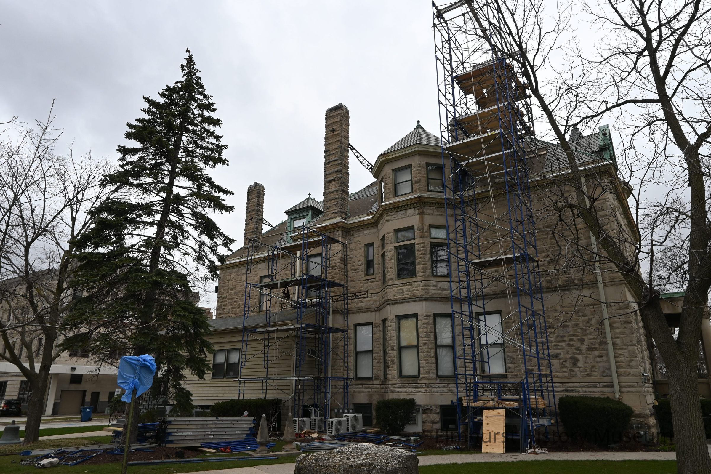Scaffolding is constructed on the south facade of the Glos Mansion to facilitate the reconstruction of the chimneys.Photograph Details