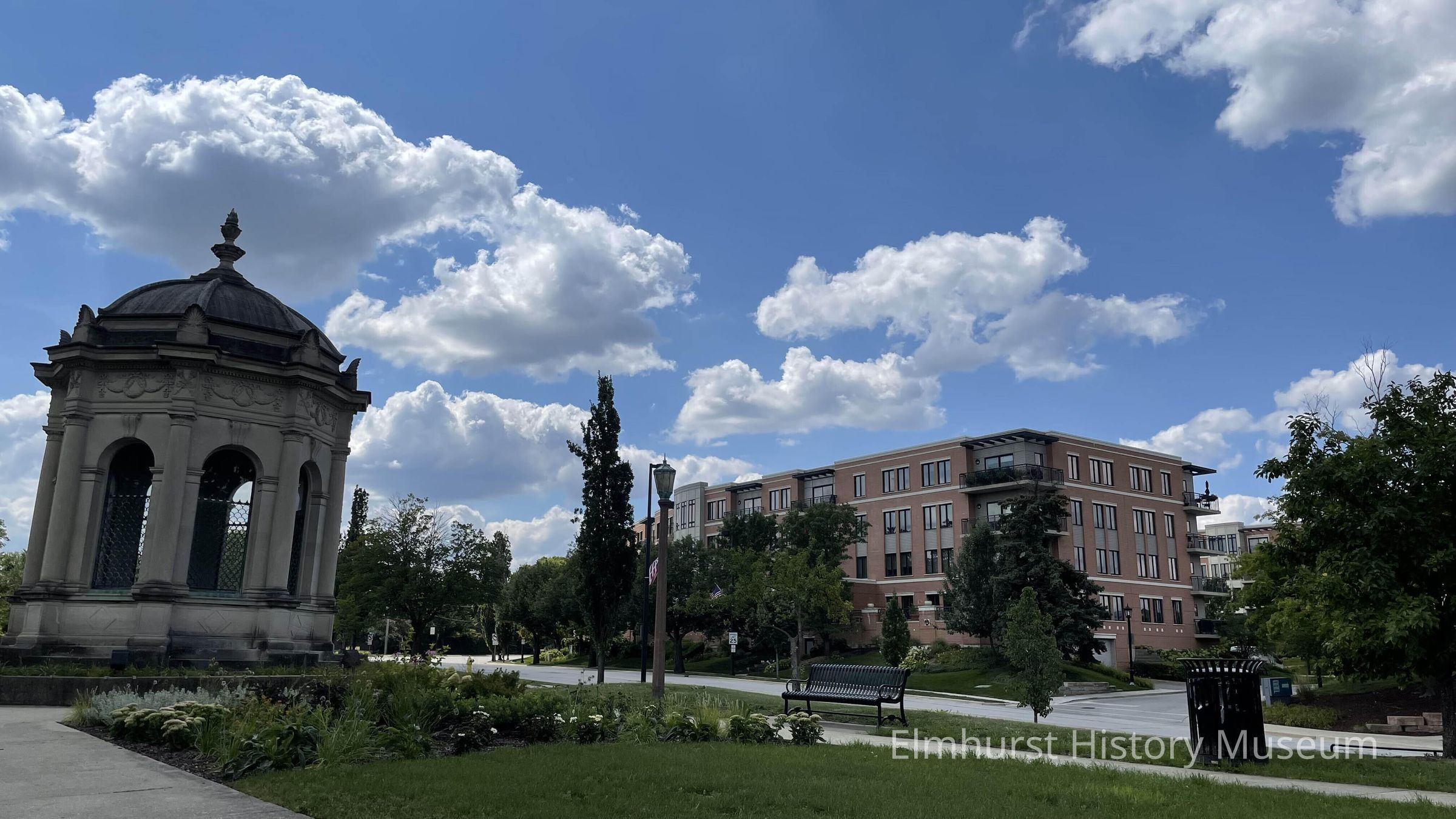 The Glos Mausoleum in Glos Memorial Park, looking southwest towards Crescent Court Condominiums.Photograph Details