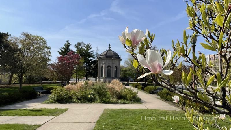 Glos Memorial Park on E. Park Avenue, managed by the Elmhurst Park District. The Glos Mausoleum, 142 E. Park Avenue, is in the background.Photograph Details