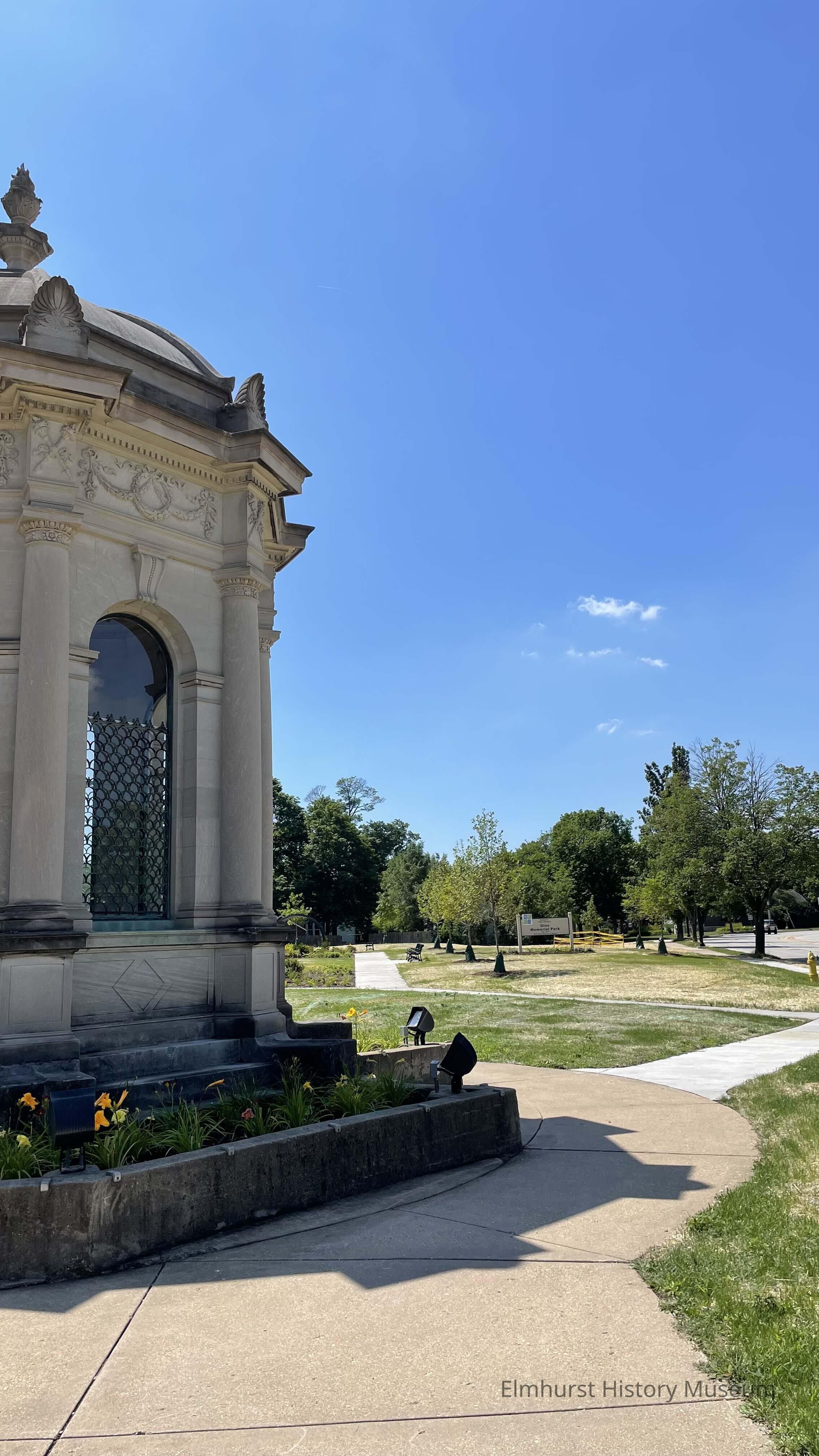 View of the Glos Mausoleum, looking south towards the newly-opened Glos Memorial Park expansion area.Photograph Details